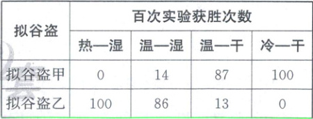 )A.拟谷盗甲不适宜在“热—湿”条件下生存,拟谷盗乙不适宜在“冷—干”条件下生存