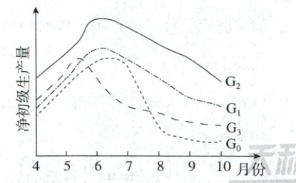 (1)根据题图信息可知,5—6月份采用$G_2$的放牧强度时净初级生产量最高;不放牧草地7月份净初级生产量高,积累大量有机物,故8月份不放牧草地生物量较大;10月的净初级生产量不足,牧民需要补充饲料或是减少牲畜头数。
