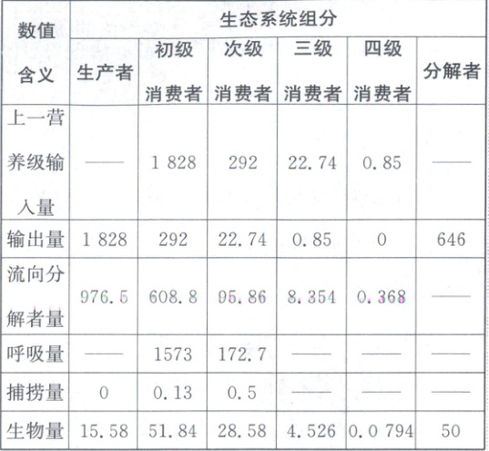 19. 科研人员对某港湾生态系统中生物组分、生物量以及部分能量流动情况进行了定量分析,结果如表所示。已知分解者中的部分能量(数值见表)可被初级消费者所同化,未知的数据用“——”表示。下列说法正确的是 (