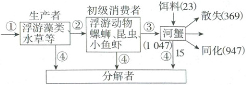 (947)/②×100%所得的数据不是该生态系统第二和第三营养级间的能量传递效率,原因是能量传递效率指的是两个相邻营养级的同化量之比,河蟹只是第三营养级中的一个种群,947不代表第三营养级同化的能量,同时还含有饵料中的能量。
