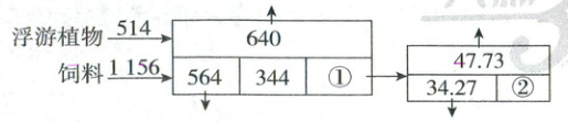 由左侧图分析可知,向上的箭头代表呼吸作用中以热能形式散失的能量,向下的箭头代表分解者利用的能量,第三营养级未利用的能量,由左侧图分析可知,生产者是生态系统的基石,鱼类是消费者,A错误;浮游植物1156,饲料564,第二营养级的同化量:514+1156+156=1670J/(cm²·a),①为流入第三营养级的同化量=1670 - 344 = 122J/(cm²·a),第二、三营养级的能量传递效率:122/1670×100%≈7.3%,C正确;第二营养级有大量饲料的投入,所以该生物量金字塔是上宽下窄的倒金字塔形,D错误。