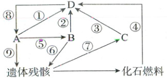 10 D 生态系统的物质循环 A、B、C都有箭头指向D,故D是大气中的CO₂库。D有箭头指向A,故A是生产者,是生态系统的基石。遗体残骸能被C利用,故C为分解者,B是消费者,在生态系统的物质循环中具有重要作用,A正确;碳元素在生物群落间以含碳有机物的形式流动,在图中的序号是⑤⑥⑦⑨,B正确;“碳中和”是指通过植树造林、节能减排等形式,抵消CO₂排放总量,实现相对“零排放”,用图中数字构建数学模型即为⑧=①+②+③+④,C正确;植树造林是“碳捕集”的重要措施,D错误。