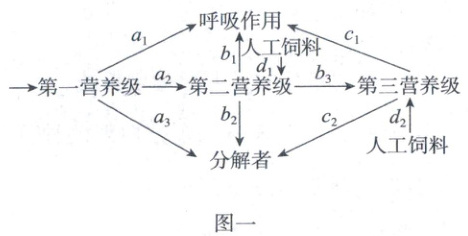 18. 某农场中的能量流动简图如图一所示,其中$a_2$和$b_3$分别为第二、第三营养级从上一营养级同化的能量,$d_1$和$d_2$为人工饲料中被同化的能量。图二所示为该农业生态系统碳循环的过程简图,其中甲~丁属于生态系统的组成成分。