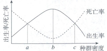 5. 某种社会性昆虫种群密度与出生率和死亡率关系曲线如图,下列分析错误的是 (