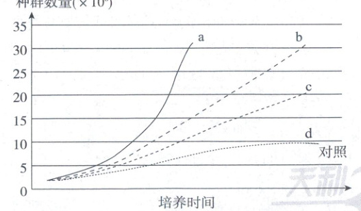 6. 兴趣小组为探究某细菌在不同条件下的种群数量变化,共设置了四组实验,a、b、c三组分别每3 h、12 h和24 h更新培养液,d为对照组,其他培养条件相同,结果如图所示。下列叙述正确的是 (