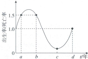 图像分析:图中a点和b点出生率与死亡率的比值相等,但是这两点的死亡率不一定相等,出生率也不一定相等,D错误。由图可知,b~c时间段内,出生率与死亡率的比值先大于1,后小于1,因此该鲤鱼种群的数量先增加后减少,A错误。a~d时间段内,c点后出生率与死亡率的比值仍小于1,表明鲤鱼种群的数量仍在继续减少,说明c点时鲤鱼种群的数量不是最少,B错误。c~d时间段内,出生率与死亡率的比值小于1,鲤鱼种群的数量减少,表明该鲤鱼种群的年龄结构为衰退型,C正确。