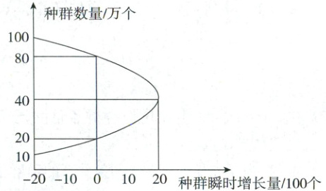 思路分析:种群瞬时增长量可表示增长速率,在一定范围内(20万~80万个),随种群数量增加,种群增长速率先升高后降低,超过一定数量(80万个)后,种群增长速率小于0,种群数量会减少并稳定在该数值附近,由此可知,该种群数量变化符合“S”形增长曲线。图中种群数量为80万个时,种群的瞬时增长量为0,此时达到K值,种群的瞬时增长量最大时种群数量达到K/2,B正确,C错误。