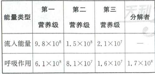 ②研究人员调查了该森林生态系统一年内的能量流动,结果如表(单位:$J·m^{-2}·a^{-1}$)。该生态系统未利用的能量约为
