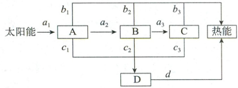 图像分析 $a_{1}$表示第一营养级A固定的全部太阳能,$a_{2}$、$a_{3}$分别表示流入第二、三营养级的能量,$b_{1}$、$b_{2}$、$b_{3}$分别表示第一、二、三营养级呼吸作用以热能形式散失的能量,$c_{1}$、$c_{2}$、$c_{3}$分别表示第一、二、三营养级被分解者利用的能量,d表示分解者呼吸作用释放的热能。