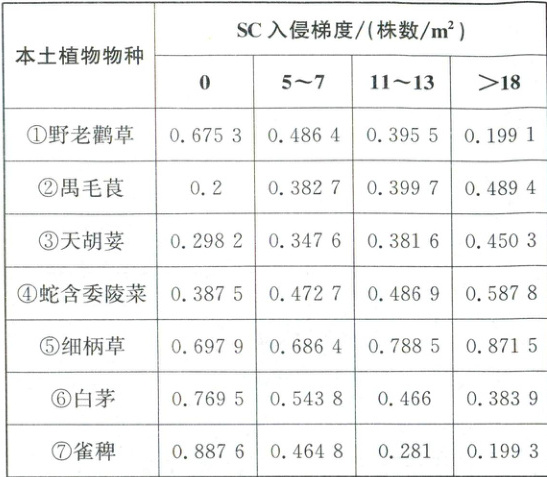 反映其数量。要研究某物种在群落中的生态位,通常要研究其所处的空间位置、占用资源的情况以及与其他物种的关系等。由表中数据可得,随 SC 入侵梯度逐渐增加,①⑥⑦