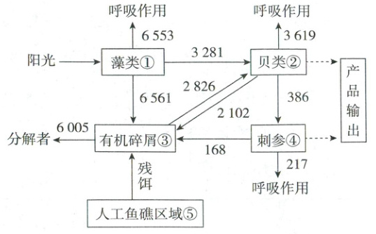 $J/(m^2·a)$。(3)产品输出时往往需要检查重金属含量,若某段时间内刺参和贝类体内某重金属元素超标,该种现象称之为