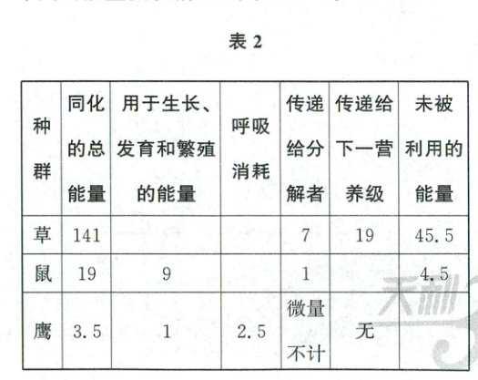 (3)如表 2 为食物链“草→鼠→鹰”中各种群一年间的能量流动情况(单位:$10^7\ kJ·a^{-1}$)。