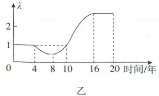 (4)分析图乙,前4年λ = 1,所以该种群数量基本不变;由于第8~10年时λ < 1,种群数量减少,第10~16年时λ > 1,此时种群数量增加。所以该鼠的种群数量第8 - 16年的变化为第8 - 10年,种群数量减少,第10 - 16年,种群数量增加。