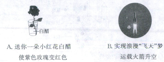 6.D【解析】化学变化和物理变化的判别 白醋使紫色玫瑰变红色、运载火箭升空、用石灰浆涂刷树木过程中均有新物质生成,属于化学变化,A,B,C错误;海水晒盐是利用蒸发水分的方法使食盐结晶析出,没有新物质生成,属于物理变化,D正确。