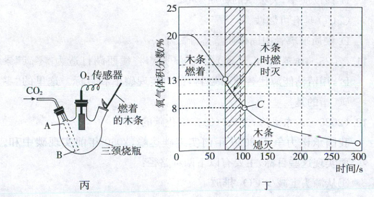 (填“A”或“B”)位置。②图丁所示 C 处燃着的木条熄灭,此时三颈烧瓶内 $CO_2$ 的体积分数约为