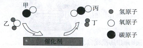 (3)根据反应的微观示意图可知,该反应的化学方程式为$CO+H₂O\overset{催化剂}{\longrightarrow}CO₂+H₂,$参加反应的甲(CO)和生成的丙(CO₂)分子个数比为1:1。