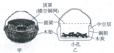 1. (2025·湖北)图甲为古代“暖宝宝”——手炉,其外层为漆有彩图的木胎,暖手时手捂木胎。图乙为手炉剖面结构示意图。下列说法错误的是(