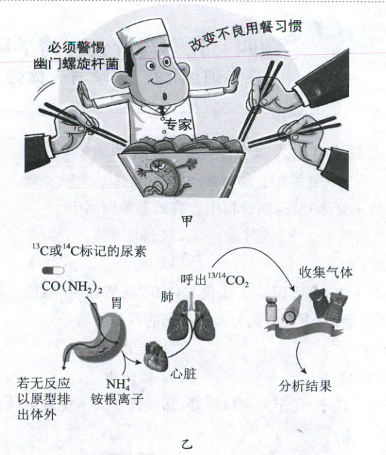 在用C-13呼吸检测幽门螺旋杆菌时,受检者要空腹口服C-13尿素胶囊,静坐约30分钟,之后将呼出的气体吹入气袋中,交给医生检测。如果胃中有幽门螺旋杆菌,其产生的尿素酶能迅速将尿素[CO(NH₂)₂]在水溶液中转变为CO₂气体和氨气(NH₃),CO₂通过血液运输进入肺排出体外,将排出的CO₂气体收集后即可在仪器上检测(如图乙)。
