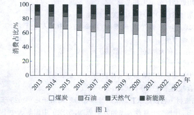 (1)图1展示了我国2013年至2023年间的能源结构消费占比。据图可知:占消费主体地位的能源是