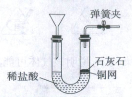 4.D [解析]二氧化碳的制取 漏斗下端不用伸入液面以下,因为气体不会从漏斗中逸出,U形管右侧形成液封,气体从右侧导管逸出[易错点],A错误;该装置能控制反应的发生和停止,不需要气体时则关闭弹簧夹,U形管右侧气压增大,液面降低到铜网以下,固体、液体分离,反应停止,而需要气体时,打开弹簧夹,气体排出,U形管右侧气压下降,液体没过铜网,则固体、液体接触,反应发生,B错误;装置中的铜网不可用铁丝网代替,因为铁能和稀盐酸反应生成氯化亚铁和氢气,使制得的二氧化碳不纯,同时会溶解铁丝网,使该装置不能再控制反应的发生与停止,C错误;该装置适用于块状固体与液体常温下反应制取气体,故可将石灰石换成锌粒,用来制取氢气,D正确。