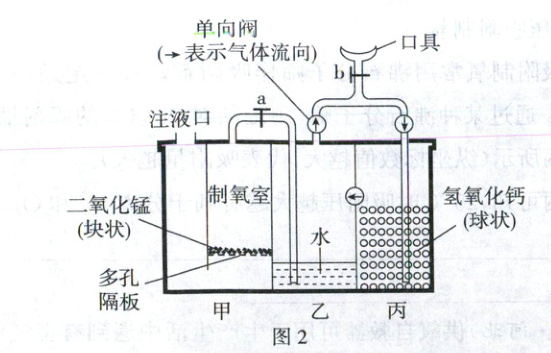 【设计制作】参照图 1 所示原理,利用透明塑料板、导管等材料,设计并制作了图 2 所示的简易供氧自救器(鼻夹、排气阀等未画出)。