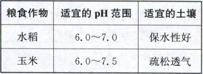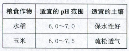 【解析】溶液酸碱性和 pH ⑥土壤平均 pH 为 5.4(<7),说明土壤呈酸性。 ⑦改良酸性土壤常用熟石灰,化学式为 Ca(OH)$_2$。 ⑧水稻适宜 pH 为 6.0∼7.0,所以 pH 调节到 6.0∼7.0 适宜种植水稻。 ⑨秸秆还田可使秸秆中的有机质和养分回归土壤,提升土壤肥力,a正确;短时间休耕可使土壤更适合作物生长,提高作物产量,不会浪费土壤资源,b错误;可因地制宜实施农作物轮作,以改良土壤结构、提高土地生产力和经济效益,c正确。