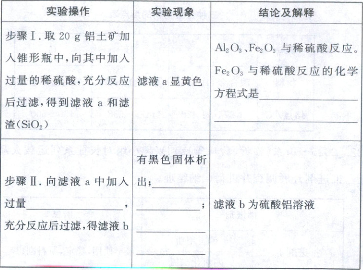 (5)氧化铁和稀硫酸反应的化学方程式为 Fe$_2$O$_3$+3H$_2$SO$_4$=Fe$_2$(SO$_4$)$_3$+3H$_2$O;氧化铁、氧化铝与稀硫酸反应,生成硫酸铁、硫酸铝,故滤液 a 中含有硫酸铁、硫酸铝及过量的稀硫酸,加入一种物质,将稀硫酸、硫酸铁反应掉,得到硫酸铝溶液,则加入的是铝粉;铝和稀硫酸反应生成硫酸铝和氢气,可以观察到有气泡产生;铝和硫酸铁反应生成硫酸铝和铁,可以看到有黑色固体析出(铁粉呈黑色)、溶液由黄色变为无色(硫酸铁溶液呈黄色、硫酸铝溶液无色)。