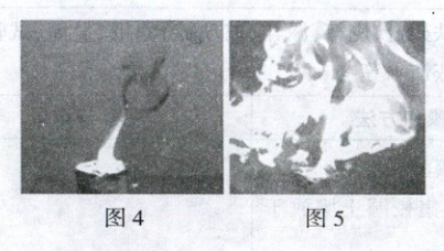 ①分别取两份等体积的航空煤油,一份放在金属瓶盖内点燃(图 4),一份用喷壶喷成细雾状后点燃(图 5)。结合实验现象分析,燃烧室内将航空煤油喷成细雾状使其充分燃烧的目的是______(答两条)。