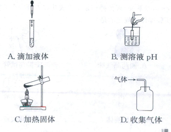 12.A[解析]实验基本操作 用胶头滴管滴加液体时,胶头滴管应垂直悬空在试管口正上方,不能伸入试管内或接触试管内壁,A正确;用pH试纸测定溶液的pH时,不能将pH试纸伸入待测液中,以免污染待测液,B错误;给试管中的固体加热时,应该用酒精灯外焰加热,同时为防止冷凝水倒流使试管炸裂,试管口应略向下倾斜,C错误;采用向上排空气法收集气体时,导管要伸入集气瓶底部,D错误。