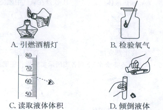 10.B[解析]实验基本操作 点燃酒精灯要用火柴点燃,禁止用燃着的酒精灯去引燃另一盏酒精灯,防止酒精洒出失火,A错误;检验氧气时将带火星的木条伸入集气瓶内,木条复燃,证明是氧气,B正确;量取液体读数时视线要与液体凹液面最低处保持相平,C错误;倾倒液体时瓶塞倒放,瓶口紧挨试管口,试剂瓶贴标签一侧要朝向手心,D错误。