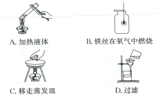 13.A[解析]基本实验操作 加热液体时,液体体积不能超过试管容积的$\frac{1}{3}$,用酒精灯的外焰加热,且试管夹应夹在距试管口$\frac{1}{4}$~$\frac{1}{3}$处,A正确;铁丝在氧气中燃烧时,为防止高温熔融物溅落使瓶底炸裂,集气瓶底部应放少量水或铺一层细沙,B错误;移走蒸发皿应用坩埚钳,不能用手直接拿取,以防烫伤,C错误;过滤时应用玻璃棒引流,漏斗下端应紧贴烧杯内壁,D错误。