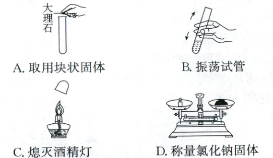 14.C[解析]实验基本操作 块状固体要用镊子夹取,操作要领“一平、二放、三慢竖”,即先将试管横放,用镊子将块状固体试剂放入试管口,然后缓慢地将试管竖立起来,使块状固体缓缓地滑到容器底部,以免打破容器,A错误;振荡试管内液体时,用手腕的力量左右振荡,而不能上下振荡试管,B错误;熄灭酒精灯时,用灯帽盖灭,采取隔绝氧气的方法灭火,C正确;用托盘天平称量固体物质的质量时,要注意“左物右码”,且要垫称量纸,D错误。
