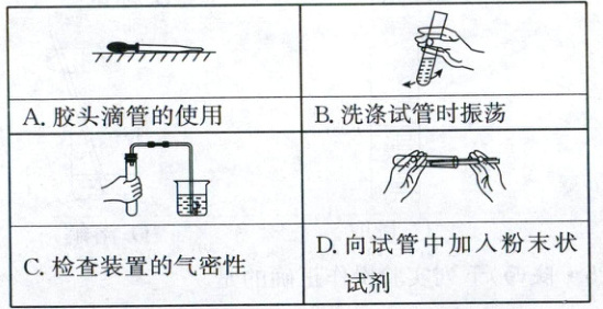 15.A [解析]实验基本操作 胶头滴管使用时,不能平放或倒置,以免腐蚀胶帽,A错误;洗涤试管时,用手腕的力量左右振荡,B正确;检查装置的气密性时,连接好仪器,将导管末端放入水中,再用手握住试管外壁,若观察到导管口有气泡冒出,松开手后,导管中形成一段水柱,则说明装置气密性良好,C正确;向试管中加入粉末状试剂时,应将试管横放,用药匙或纸槽将试剂送到试管底部,再慢慢竖起试管,D正确。