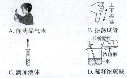 16.B[解析]实验基本操作 闻药品的气味时,应用手在瓶口轻轻地扇动,使极少量的气体飘进鼻子中,不能将鼻子凑到瓶口去闻药品的气味,A正确;振荡试管内液体时,用手腕的力量左右振荡,不能上下振荡试管[易错点],B错误;使用胶头滴管滴加少量液体时,注意胶头滴管不能伸入试管内或接触试管内壁,应垂直悬空在试管口正上方滴加液体,防止污染胶头滴管,C正确;稀释浓硫酸时,要把浓硫酸沿器壁慢慢地注入水中,同时用玻璃棒不断搅拌,以使热量及时扩散,一定不能把水注入浓硫酸中,防止酸液飞溅,D正确。
