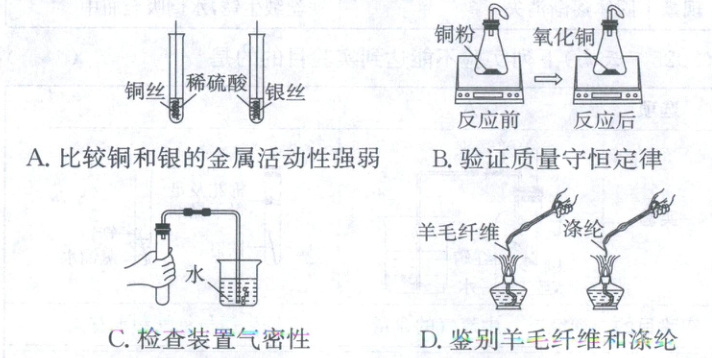 8.A【解析】实验方案的设计与评价 铜丝、银丝都不与稀硫酸反应,将铜丝和银丝分别插入稀硫酸中,都无明显变化,无法比较二者的金属活动性强弱,A不能达到实验目的;铜粉与氧气在密闭容器中反应生成氧化铜,反应前后天平示数几乎不变,可验证质量守恒定律,B能达到实验目的;用手紧握试管,试管内空气受热膨胀,观察到导管口有气泡冒出,说明该装置气密性良好,C能达到实验目的;羊毛纤维灼烧有烧焦羽毛气味,涤纶灼烧有特殊气味,利用灼烧的方法可鉴别二者,D能达到实验目的。