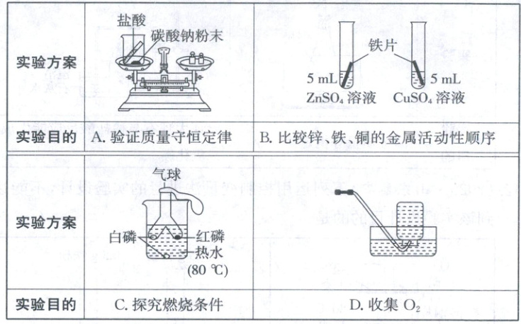 9.A【解析】实验方案的设计与评价 验证质量守恒定律时,如果反应物或生成物中有气体,装置需密闭[关键点],盐酸与碳酸钠反应有二氧化碳气体产生,该装置没有密闭,会造成反应前后物质质量不相等的假象,A符合题意;左侧试管内,铁片与ZnSO₄溶液不反应,说明金属活动性大小为Zn>Fe,右侧试管内,铁片与CuSO₄溶液反应,说明金属活动性大小为Fe>Cu,故可得出金属活动性顺序为Zn>Fe>Cu的实验结论,B不符合题意;管内白磷燃烧,红磷不燃烧,说明燃烧需要温度达到可燃物着火点,管内白磷燃烧,热水中的白磷不燃烧,说明燃烧需要可燃物与氧气接触,C不符合题意;氧气不易溶于水,可用排水法收集,D不符合题意。