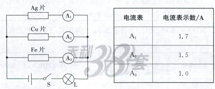 14.D【解析】金属的性质 由表格数据可知,在金属片横截面积、长度及电压相同的情况下,电流表的数据关系为A₁>A₂>A₃,故导电性Ag>Cu>Fe,A项正确;在电压相等的情况下,电阻越大,电流越小,故三种金属中,Fe片电阻最大,B项正确;并联电路中,电压相等,设计并联电路的目的是控制变量(即保持电压相等),C项正确;在串联电路中电流相等,仅利用电流表不能比较三种金属的导电性强弱,D项错误。