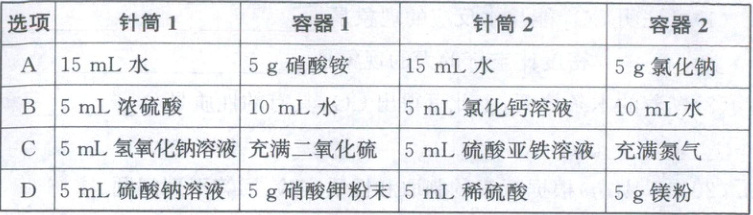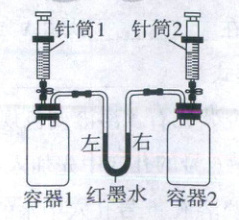 A $×$ 容器1中硝酸铵溶于水吸热,气体体积变小,容器2中氯化钠溶于水无明显吸放热现象,气体体积无明显变化,现象为红墨水左高右低