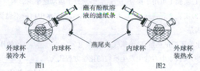 4.D【解析】分子性质实验检查装置气密性时,用燕尾夹夹住透明软管,拉动注射器活塞,若装置气密性良好,装置内气压会减小,松手后,在外界大气压作用下,活塞会恢复原位,A正确;分子在不断运动,且温度越高,分子运动速率越快,图2中外球杯装的是热水,图1中外球杯装的是冷水,图2中氨气分子运动快,故图2中的滤纸条比图1的先变红,B、C正确;氨水显碱性,可以使酚酞溶液变红,但盐酸显酸性,不能使酚酞溶液变红,故将浓氨水换成浓盐酸不能观察到相同的现象,D错误。