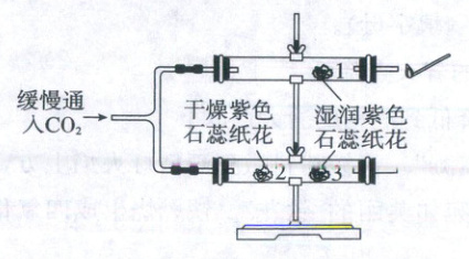 (1)纸花1和3变红,2不变红,由此可证明二氧化碳能与水反应;由纸花3比1先变红的现象可知,二氧化碳密度比空气的大。