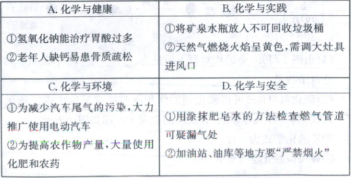 4.D 【解析】化学知识归纳 氢氧化钠有强烈的腐蚀性,不能治疗胃酸过多[关键点],A 错误;矿泉水瓶属于可回收垃圾,B 错误;大量使用化肥和农药会污染地下水、土壤,C 错误;用涂抹肥皂水的方法检查燃气管道可疑漏气处,若漏气会产生连续气泡;加油站、油库附近空气中有大量易燃物,这些地方要“严禁烟火”,以防止发生爆炸,D 正确。
