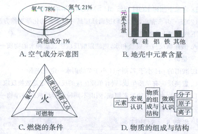 9.A 【解析】空气的成分+地壳中元素的含量+燃烧的条件+物质的组成与构成 空气中各气体的体积分数:氮气约占78%、氧气约占21%,其他成分约占1%,A错误;地壳中含量排前4位的元素由高到低依次为氧(48.6%)、硅(26.3%)、铝(7.73%)、铁(4.75%),其他元素为12.62%,B正确;燃烧的条件是可燃物、氧气、温度达到可燃物的着火点,C正确;从宏观来说,物质由元素组成,从微观来说,物质由分子、原子、离子构成,D正确。