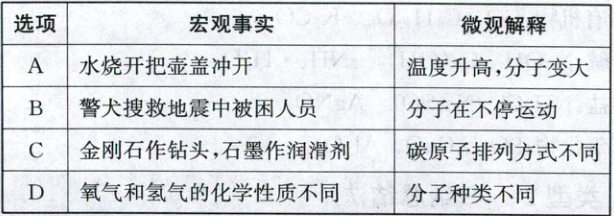 18.A【解析】分子的基本性质 水烧开时把壶盖冲开是因为温度升高,分子间的间隔变大,A错误;由于分子不断运动,警犬能闻到地震中被困人员的气味进行搜救,B正确;金刚石和石墨都是碳元素组成的单质,但由于碳原子排列方式不同,决定了二者物理性质差别很大,金刚石硬度大,可作钻头,石墨具有滑腻感,可用作润滑剂,C正确;氧气由氧分子构成,氢气由氢分子构成,不同种类的分子化学性质不同,D正确。