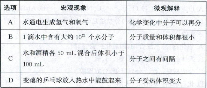 17.D【解析】分子的性质 水通电生成氢气和氧气,是水在通电时,水分子分解为氢原子和氧原子,然后氢原子、氧原子重新组合,形成氢分子和氧分子,说明化学变化中分子可以再分,A正确;1滴水的质量和体积都很小,1滴水中含有大约10²¹个水分子,说明分子的质量和体积都很小,B正确;分子之间有间隔,水和酒精混合时,水分子、酒精分子运动到对方的分子间隔中,故水和酒精各50mL混合后体积小于100mL,C正确;变瘪的乒乓球放入热水中能鼓起来,是因为分子之间有间隔,温度升高,分子间的间隔增大,而分子大小不变,D错误。
