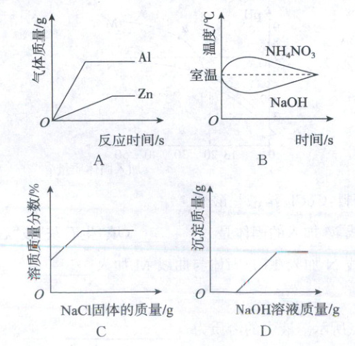 等质量的铝、锌与盐酸完全反应,铝生成氢气的质量比锌多,A 正确;向两份等质量的水中分别加入相同质量的 $NaOH$ 和 $NH_4NO_3$ 固体,$NaOH$ 溶于水放热,温度升高,$NH_4NO_3$ 溶于水吸热,温度降低,但最终都恢复至室温,B 错误;一定温度下,向 $NaCl$ 饱和溶液中加入 $NaCl$ 固体并搅拌,固体不再溶解,溶质质量分数不变,C 错误;向一定质量的 $HCl$ 和 $MgCl_2$ 的混合溶液中逐滴加入 $NaOH$ 溶液,$NaOH$ 先与 $HCl$ 反应,无沉淀生成,$HCl$ 反应完后,$NaOH$ 再与 $MgCl_2$ 反应生成沉淀,随着 $NaOH$ 的加入,沉淀质量不断增加,待混合溶液中 $MgCl_2$ 反应完后,沉淀质量不再变化,D 正确。