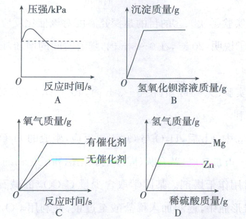 3.C[解析]图像分析 $Cu$ 与 $O_2$ 反应生成 $CuO$,该反应在加热条件下进行,容器内压强先增大,由于该反应中氧气被消耗,压强会变小,恢复至室温后,终点压强小于起点压强,A 正确;向稀硫酸和硫酸钠的混合溶液中逐滴加入氢氧化钡溶液,钡离子与硫酸根离子结合生成硫酸钡沉淀,沉淀质量从原点开始增大,待硫酸根离子完全反应后保持不变,B 正确;等质量、等溶质质量分数的过氧化氢溶液制取氧气的质量相等,催化剂只能改变化学反应速率,不影响生成氧气的质量[关键点],C 错误;等质量、等溶质质量分数的稀硫酸完全反应时,产生氢气的质量相等,即开始阶段斜线重叠,等质量的 $Mg$ 和 $Zn$ 与足量稀硫酸反应时,$Mg$ 产生氢气的质量大于 $Zn$,即 $Mg$ 对应的水平线高于 $Zn$,D 正确。