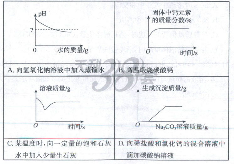 4.A[解析]化学反应与图像分析 向氢氧化钠溶液中加入蒸馏水,溶液的 $pH$ 由大于 $7$ 逐渐降低,无限接近 $7$,但不能达到 $7$ 或小于 $7$,A 错误;碳酸钙高温下分解,生成氧化钙和二氧化碳,固体质量减小,而固体中钙元素的质量不变,故固体中钙元素的质量分数逐渐升高,碳酸钙完全分解时,固体中钙元素质量分数达到最大值且不再变化,B 正确;某温度下向一定量的饱和石灰水中加入少量生石灰,生石灰和水反应生成氢氧化钙,溶液中溶剂质量减小,且反应中放出大量的热,氢氧化钙的溶解度随温度升高而减小,溶剂质量减小、溶液温度升高都会使氢氧化钙析出,溶剂质量减小、氢氧化钙析出都会造成溶液质量减小,温度恢复至室温,氢氧化钙的溶解度又增大,部分氢氧化钙继续溶解,故溶液质量又增大,但由于溶剂减少,最终溶液质量小于原溶液质量,C 正确;向稀盐酸和氯化钙的混合溶液中滴加碳酸钠溶液,碳酸钠溶液先和稀盐酸反应生成氯化钠、水和二氧化碳,稀盐酸反应完后,碳酸钠溶液再与氯化钙反应生成碳酸钙沉淀和氯化钠,故反应一段时间后才能生成沉淀,D 正确。