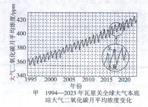 1994年,中国气象局在青海省海拔3816米的瓦里关山上建成全球大气本底站。三十年来,驻站员利用高精度仪器获得了准确、连续、海量的CO₂浓度观测数据,绘制了业界著名的“瓦里关曲线”(图甲)。该曲线反映了北半球中纬度地区本底站大气CO₂浓度长期变化趋势,为国际社会在应对气候变化上形成共识作出了中国贡献。