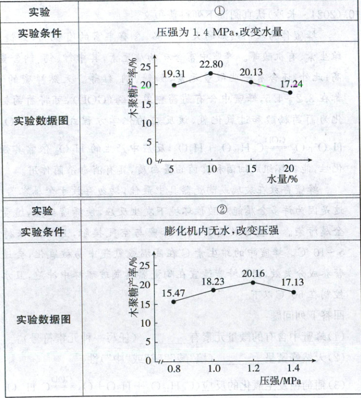 (4)由【查阅资料】可知,无水条件下,当机内压强≥1.4MPa时,膨化机内温度较高,甚至能达到玉米芯的着火点,故选择有水条件下生产木聚糖更为安全,则根据实验①可知,制取木聚糖的最佳条件是水量10%、压强1.4MPa。