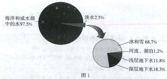 (1)由图1可知,地球上的水主要存在于海洋和咸水湖中,淡水约占地球总水量的2.5%,可供人类直接利用的河流、湖泊淡水及浅层地下水,仅约占淡水总量的11.8%+1.2%=13%。